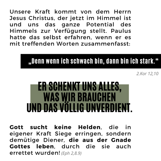Unsere Kraft kommt von dem Herrn Jesus Christus, der jetzt im Himmel ist und uns das ganze Potential des Himmels zur Verfügung stellt. Paulus hatte das selbst erfahren, wenn er es mit treffenden Worten zusammenfasst: „Denn wenn ich schwach bin, dann bin ich stark.“ (2.Kor 12,10) Er schenkt uns alles, was wir brauchen und das völlig unverdient.