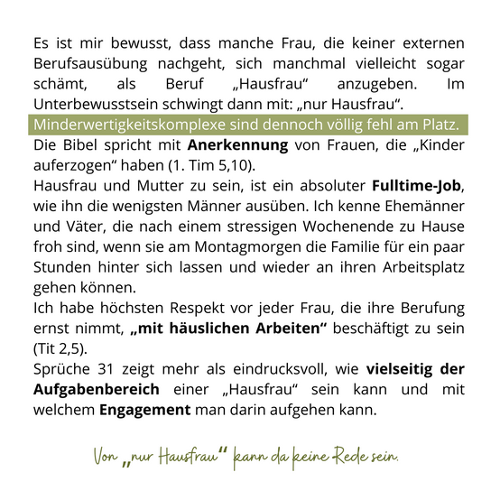 Es ist mir bewusst, dass manche Frau, die keiner externen Berufsausübung nachgeht, sich manchmal vielleicht sogar schämt, als Beruf „Hausfrau“ anzugeben. Im Unterbewusstsein schwingt dann mit: „nur Hausfrau“. Minderwertigkeitskomplexe sind dennoch völlig fehl am Platz. Die Bibel spricht mit Anerkennung von Frauen, die „Kinder auferzogen“ haben (1. Tim 5,10). Hausfrau und Mutter zu sein, ist ein absoluter Fulltime-Job, wie ihn die wenigsten Männer ausüben. Ich kenne Ehemänner und Väter, die nach einem stressigen Wochenende zu Hause froh sind, wenn sie am Montagmorgen die Familie für ein paar Stunden hinter sich lassen und wieder an ihren Arbeitsplatz gehen können. Ich habe höchsten Respekt vor jeder Frau, die ihre Berufung ernst nimmt, „mit häuslichen Arbeiten“ beschäftigt zu sein (Tit 2,5). Sprüche 31 zeigt mehr als eindrucksvoll, wie vielseitig der Aufgabenbereich einer „Hausfrau“ sein kann und mit welchem Engagement man darin aufgehen kann. Von „nur Hausfrau“ kann da keine Rede sein.