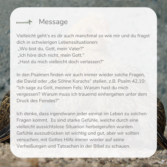 In den Psalmen finden wir auch immer wieder solche Fragen, die David oder „die Söhne Korahs“ stellen, z.B. Psalm 42,10: “Ich sage zu Gott, meinem Fels: Warum hast du mich vergessen? Warum muss ich trauernd einhergehen unter dem Druck des Feindes?”