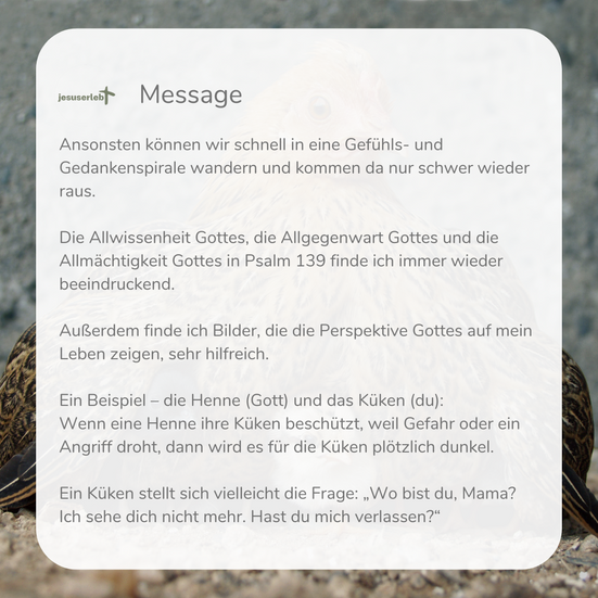 Außerdem finde ich Bilder, die die Perspektive Gottes auf mein Leben zeigen, sehr hilfreich.