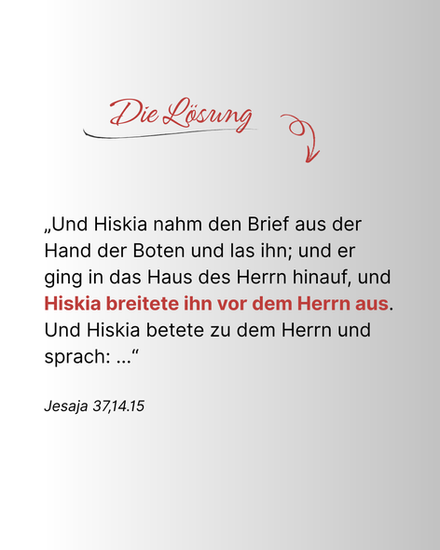 „Und Hiskia nahm den Brief aus der Hand der Boten und las ihn; und er ging in das Haus des Herrn hinauf, und Hiskia breitete ihn vor dem Herrn aus. Und Hiskia betete zu dem Herrn und sprach: …“ (Jesaja 37,14.15)