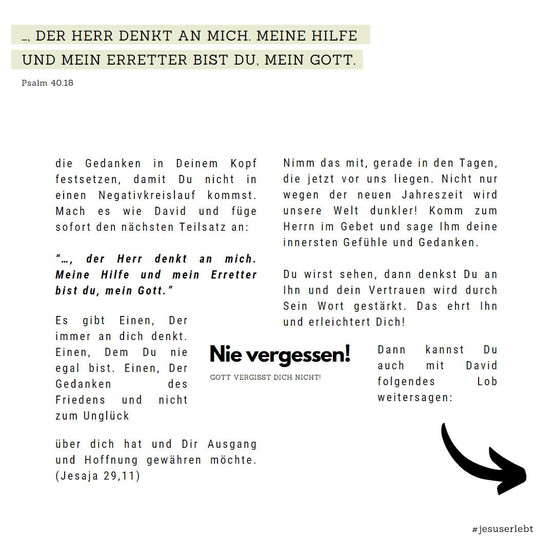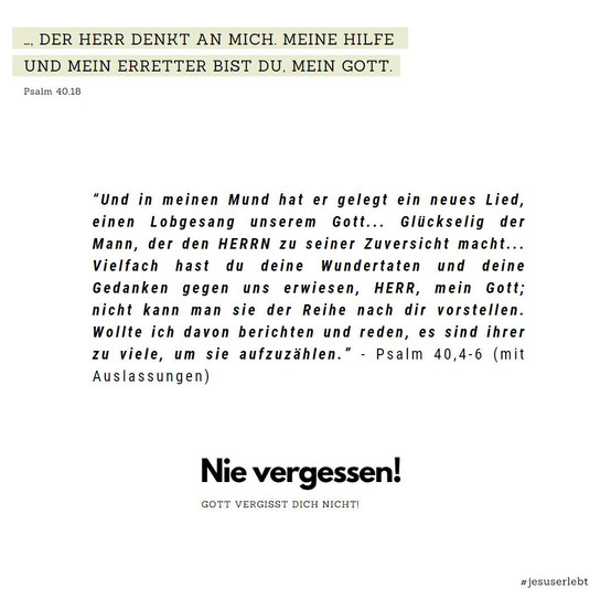 “…, der Herr denkt an mich. Meine Hilfe und mein Erretter bist du, mein Gott.”